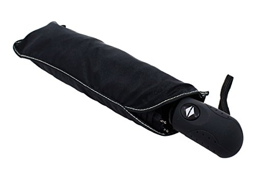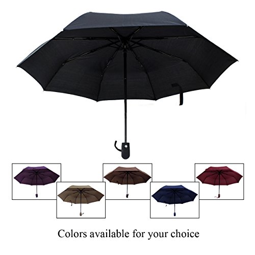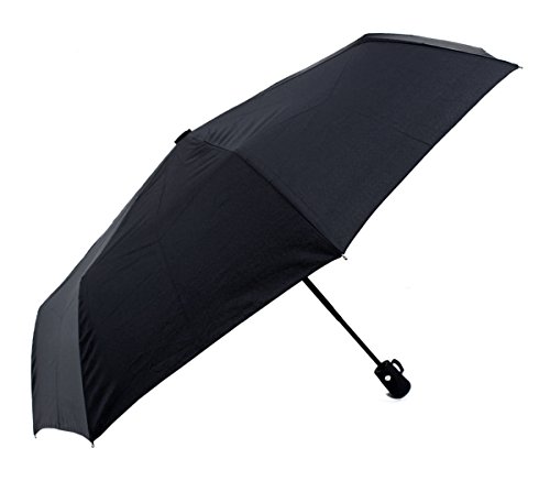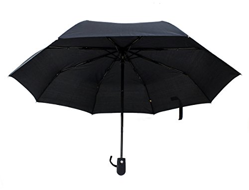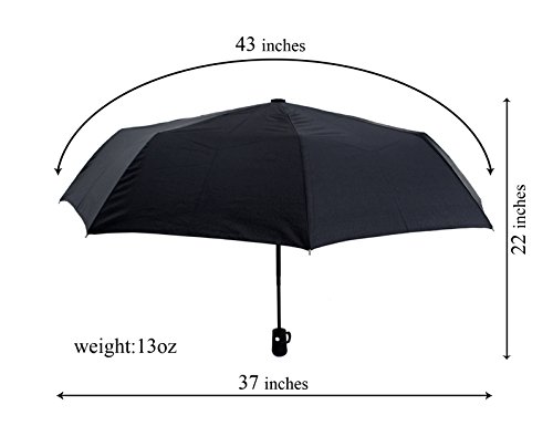 Product Description Thoughtfully designed to keep you dry in any situation - getting in/out of car or having your hands full - the umbrella's canopy automatically opens and closes in less than a second at the simple push of a button. After the canopy collapses, manually push the shaft down into locked position and the auto open mechanism is ready to be used again. Provides ample coverage opening up to 43" arc and 37" diameter, perfect for 1 person and covers 2 marginally. When closed, it folds into a conveniently compact size, measuring just 12" long and weighing at 13oz, fitting easily and neatly in a backpack, case or tote bag. Its compact size and light weight makes it the perfect choice for any busy traveler or those ever-ready. Own it in multiple colors - stash one each in your daily bag, by the door, in your office desk drawer, and in the storage pocket of every door of your car! Keeping Dry. Made from high-density carom cloth, the canopy is water resistant and provides UV protection. Even though many brands claim that their umbrellas are 'windproof', it is hard to remain sheltered without risking damage to your umbrella in extreme weather. While our umbrellas can endure strong winds - its strengthened black steel shaft and ribs (8-rib) are constructed to ensure a strong, flexible and wind-resistant product and the reinforced ribs make it tougher for them to be turned inside-out in rough storms - they are specially designed to flip inside-out in dangerous winds to prevent a Mary Poppins situation and will revert without damage with a simple touch of the auto close button. Ergonomic Comes equipped with a palm-sized ergonomic curve-shaped handle for easy and comfortable hold in one hand, ensuring a secure grip without fear of slippage in the rain. Also includes a sleek easy slip-on storage sleeve to keep the umbrella neatly stored and the wrist strap allows for convenient hands free carrying. 0