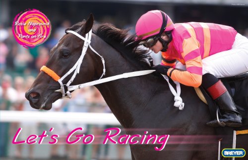 Set features a chestnut Thoroughbred racehorse and a female jockey dressed in racing silks