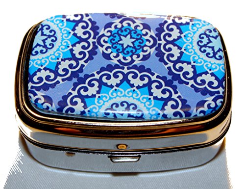 Product Description12 vibrant designer patterns. Never lose your pills again! Removable Divider Exclusive Designer Patterns Convenient Mirror Length 2 1/4" Height: 1 1/2" Width: 3/4"0