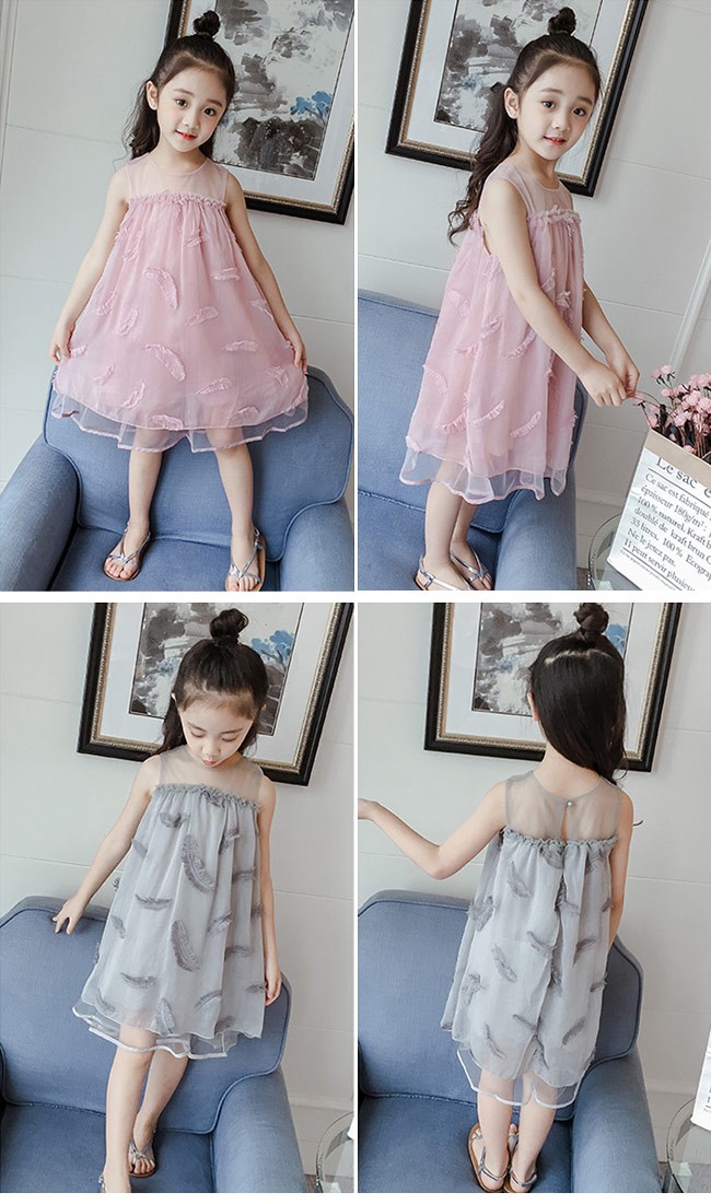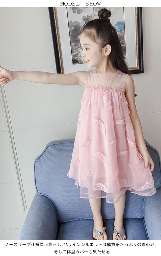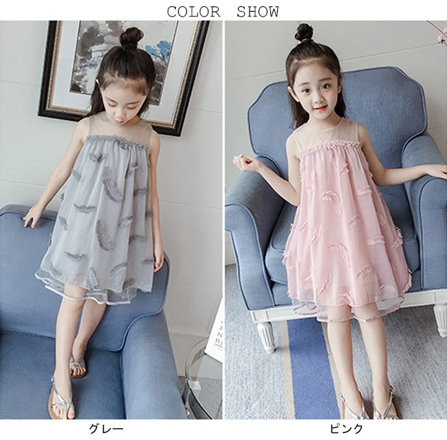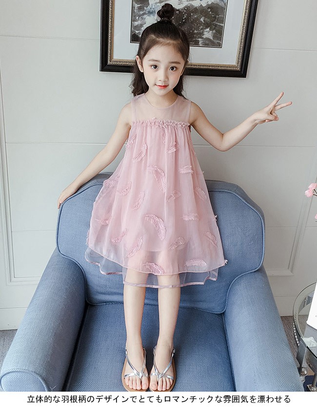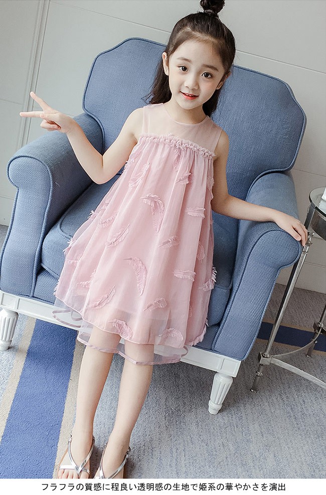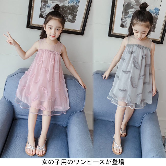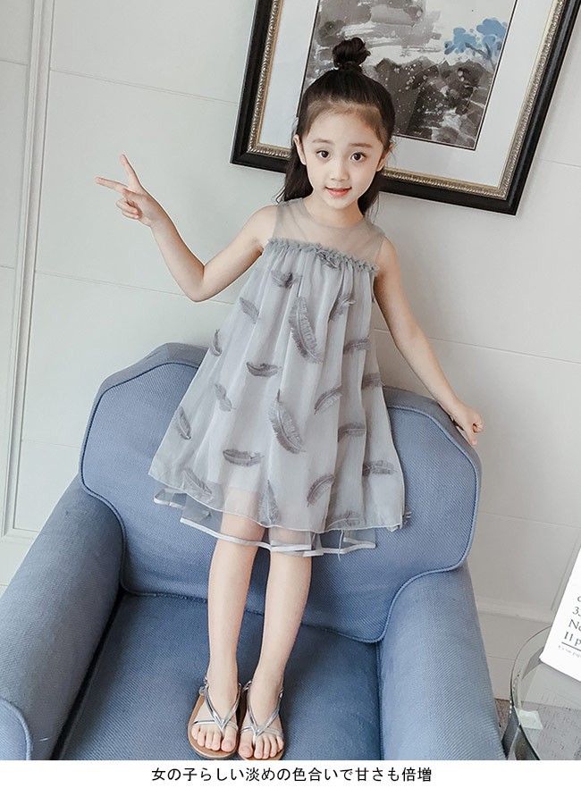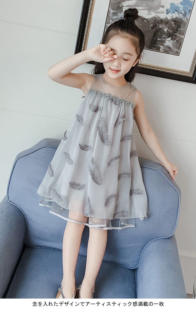 女児 ワンピース ノースリーブ 膝丈 子供服 羽根柄 チュールワンピ Aライン 女の子 夏物 裏地付き 丸襟 キッズ用 膝丈ワンピース女の子用のワンピースが登場ノースリーブ仕様に可愛らしいAラインシルエットは解放感たっぷりの着心地、そして体型カバーも果たせる立体的な羽根柄のデザインでとてもロマンチックな雰囲気を漂わせるフラフラの質感に程良い透明感の生地で姫系の華やかさを演出女の子らしい淡めの色合いで甘さも倍増念を入れたデザインでアーティスティック感満載の一枚カラー:グレー ピンク素材 ポリエステルサイズ(cm) 110 120 130 140 150110 総丈64 バスト63120 総丈67 バスト66130 総丈71 バスト69140 総丈74 バスト73150 総丈78 バスト76ご注意:※サイズは平置きサイズです。素人採寸ですので、若干の誤差がございます、ご了承ください。