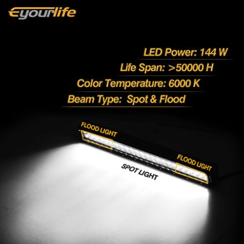Super Bright Driving Vision: Eyourlife 144W flood and spot beam combo which contains Spot (with 36 LED angle of 30 degree)/Flood (with 12 LED angle of 60 degrees) guarantees a brighter lighting ray of deep length irradiation and broad view