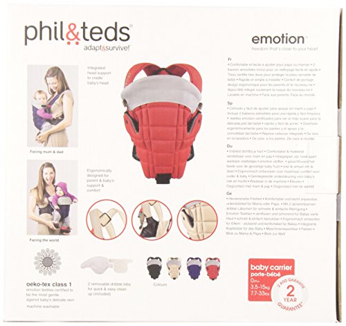 -. Binding : Baby Product -. Brand : phil&teds -. Color : Midnight Blue -. Feature : Carries 7.7 - 33lbs. / Face mom & dad or face the world- ergonomically designed & easy to adjust independently. / High performance cotton blend construction with breathable sides. / Cross over back & zips for comfort & speed of fit to your body. / Comes with 2 dribble bibs for quick & easy cleaning -. Label : phil&teds -. Manufacturer : phil&teds -. ProductGroup : Baby Product -. ProductTypeName : BABY_PRODUCT -. Publisher : phil&teds -. Size : One Size -. Studio : phil&teds -. Title : phil&teds Emotion Front Carrier