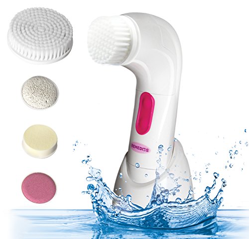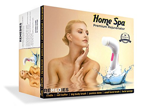 Quality Microdermabrasion Machine Remedies Home Spa premium skin cleansing system uses a powerful motor to spin the cleansing brush heads effortlessly to clean skin thoroughly and leaving skin smooth and soft. The dermabrasion action loosens dirt, removes makeup, dead skin cells. Providing a total cleaning experience, for healthier, more beautiful skin. Great for all skin care like; Acne spots and Acne scar treatment, Body acne remover & Dark spot corrector It operates with five replaceable brush heads; Facial brush for all skin types, Sponge applicator for lotions and moisturizers, body brush for exchangeable attachments; pumice stone to remove calluses from elbows and feet. It features two speeds; low for face and body and high for dermabrasion, The Remedies Micro dermabrasion Exfoliator waterproof Skin Brush System unit is ideal for use in the bathroom with cradle for support, use at the sink or take in the shower. Good for women, men & teens.Feature