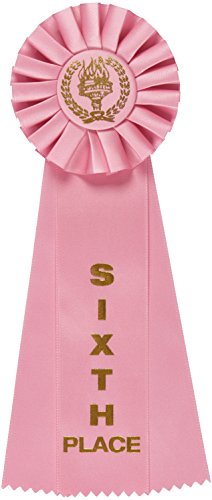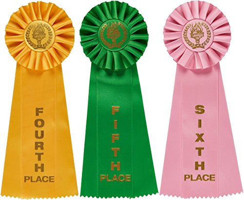 Set Includes 3 rosette victory award ribbons 4th, 5th, and 6th places with the appropriate colors of Blue red and White -3 pack.