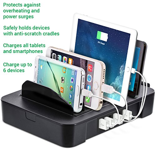 6X POWERED USB PORTS (2.4A Max Per Port) Includes 6 slots with anti-scratch non-slippery silicone pads to Safely hold and organize up to 6 devices