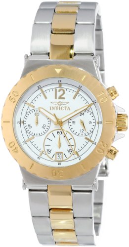 -. Feature : A timeless two-tone design complements the clean, classic white and gold-tone dial of this beautiful Invicta watch. / Japanese Quartz movement with analog display / Chronograph functions of 60-minute, 60-second, and 24-hour / Features include protective mineral crystal dial window, date window at six o'clock, luminosity, stopwatch / Water resistant to 165 feet (50 M): suitable for swimming and showering