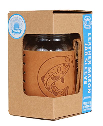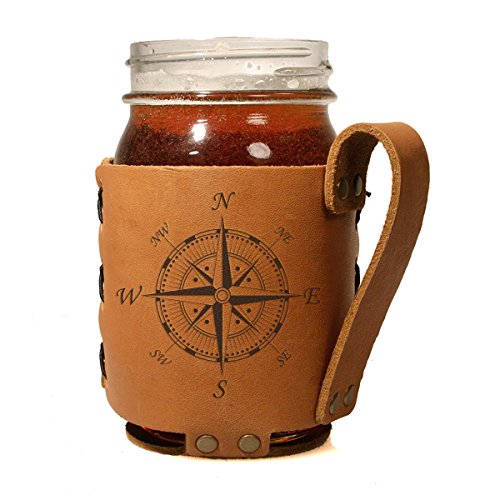 Compass Design - Leather Sleeve with Handle for Regular Mason Jar - Gift Box Kit includes 16oz mason jar with sleeve