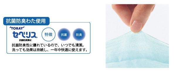 抗菌防臭性に優れた、東レの抗菌防臭わた「セベリス(R)」を使用。洗っても効果は持続するため、いつでも清潔に、一年中快適にご使用いただけます。使い込むほど柔らかいガーゼ素材で通気性も良く、さらりとした肌触りやふわっと軽い掛け心地が魅力です。中わた入りでふんわりしていて、冷えから身体を守ってくれる嬉しい1枚!!冷房での寝冷え対策や少し汗ばむ季節にも最適です。 |