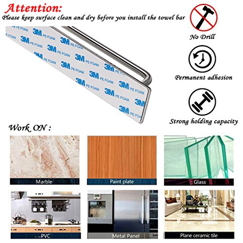 ● This adhesive towel bar is made with 3M Strong sticky adhesive, very strong, so you apply it to the wall or other places, it is not easy to remove. If you want to apply to the wall, especially the gypsum surface, please choose the position to stick with care before use.