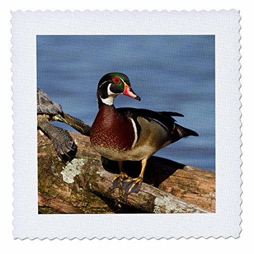 3dRose Wood Duck and Slider Turtle on Log In Wetland, Marion, Illinois, USA. - Quilt Square, 8 by 8-Inch (qs_205577_3)