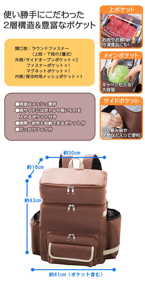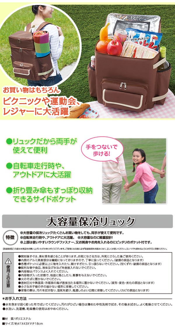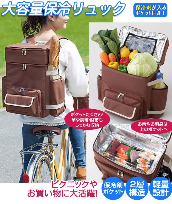 | <h1>自転車走行時やお買い物には両手が使えて便利な保冷リュック/ピクニックやレジャー、アウトドア、運動会など大活躍/キャベツもすっぽり入る大容量/軽量設計/保冷剤ポケット付き/卵やお肉、お魚、冷凍食品の保管は上部ポケットがオススメ/収納しやすい/整理整頓/ペットボトル/折りたたみ傘/ワインボトル/携帯/財布/</h1> |