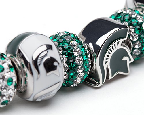This beautiful Michigan State bracelet is a one of a kind! Represent Sparty nation with four crystal charms 2 of them striped green and white and 3 green and white Stainless Steel Spartan Charms. All Michigan State charms will also fit Pandora, Troll, Brighton, Biagi and Stone Armory's stainless steel forever bracelet. Officially licensed by Michigan State University. Product lifetime guarantee. Ships within 24-48 business hours.Feature