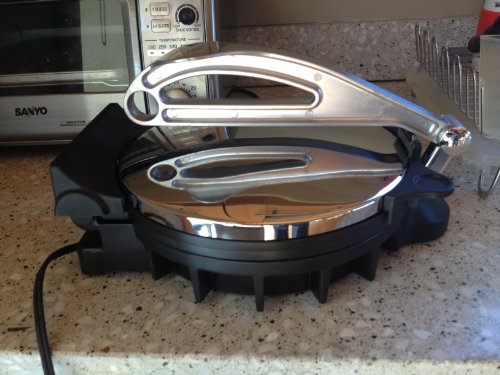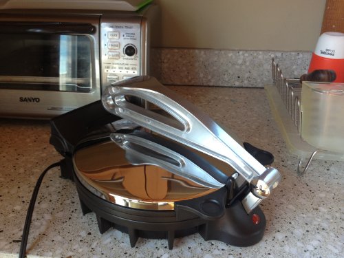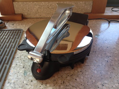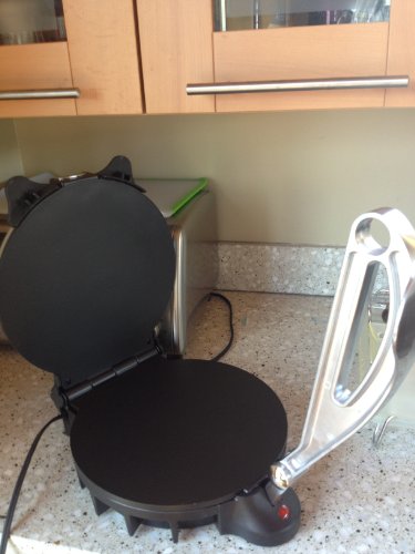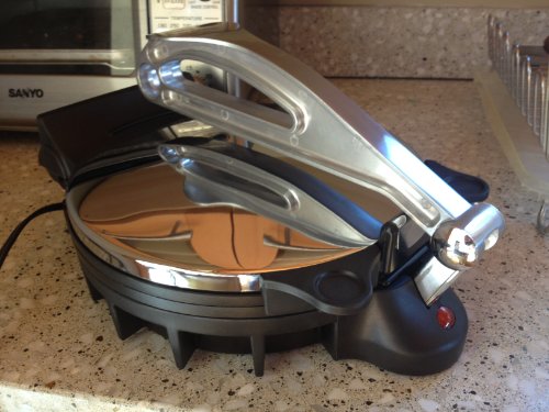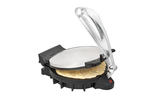 The CucinaPro Flatbread and Tortilla Maker flattens and bakes 10-inch tortillas, pitas, or flatbreads. Heavy weight aluminum, non-stick coated cooking plates distribute heat evenly for uniform baking. Make authentic homemade tacos, tostadas, quesadillas, or gyros. Effortless cleanup, just wipe clean. Ready light and convenient cord wrap. Stores upright for convenient storage.For further trouble shooting steps contact @ 216 351-3002.Note: Check Page number 4 of User manual for trouble shooting steps.