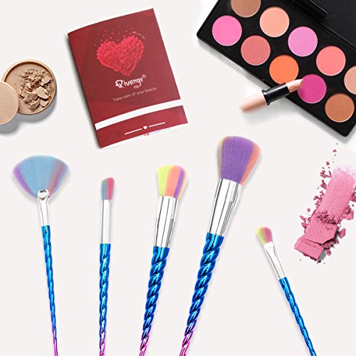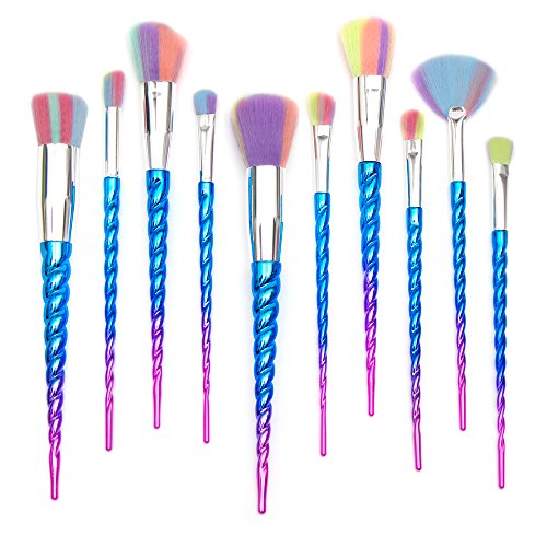 Qivange Unicorn Makeup Brushes, Foundation Eyeshadow Powder Concealer Contour Fan Brush Unicorn Designed Rainbow Hair (10pcs, Blue)