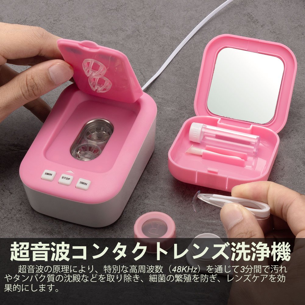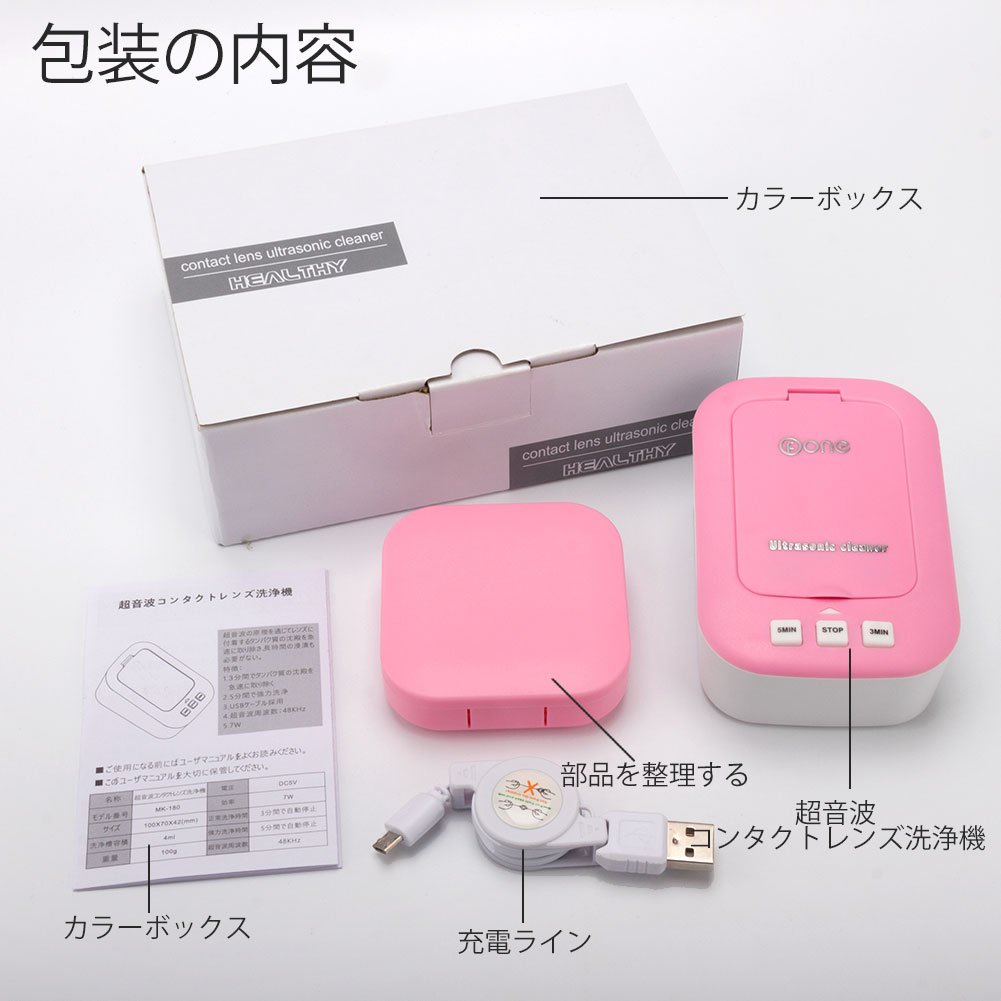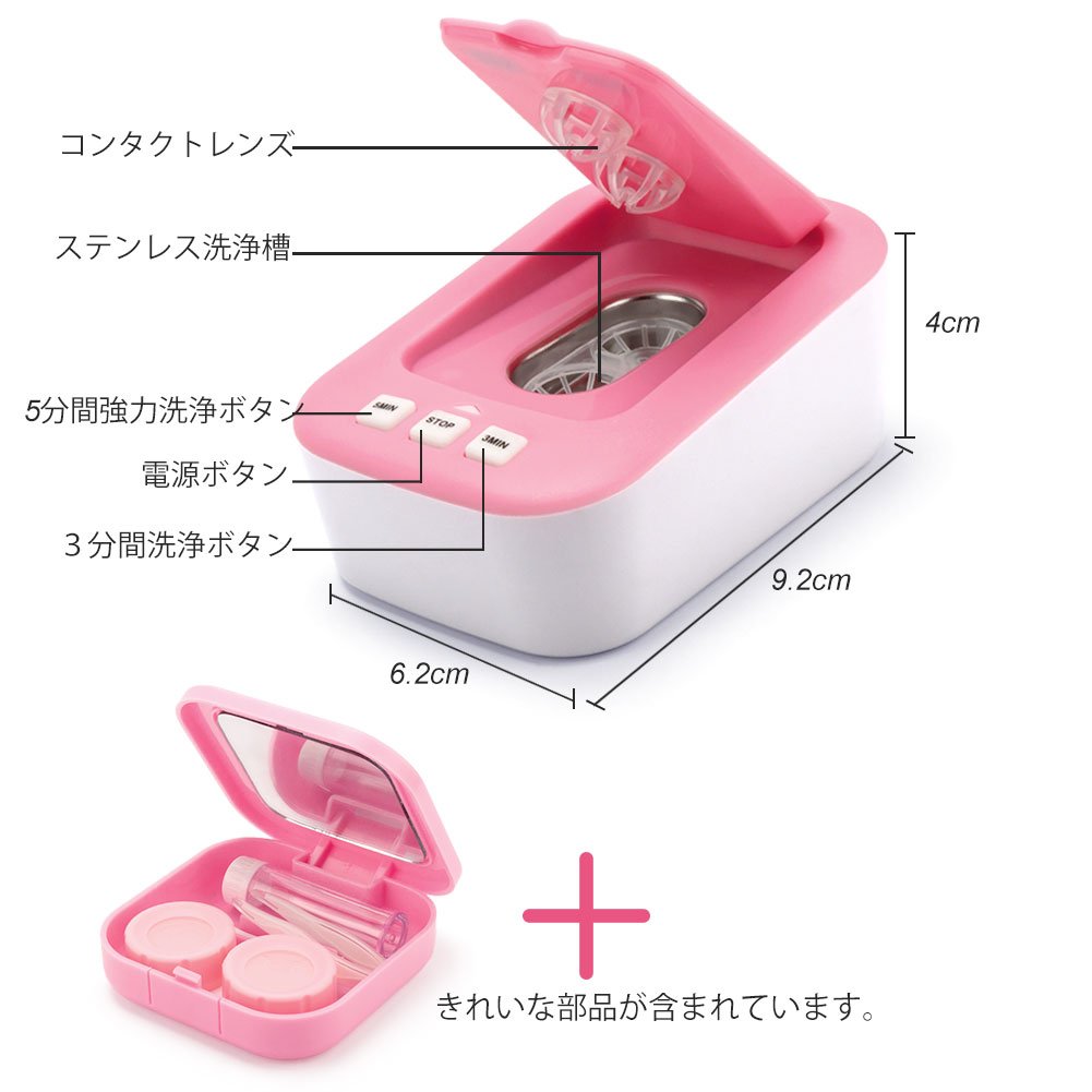 操作が簡単である: 1 まずは両手を洗い、カゴ、洗浄槽、フタをぬるま湯や浄水でを洗ってください。2. カゴを洗浄機に入れて、コンタクトレンズの洗浄液(生理食塩水または浄水)を洗浄槽に入れ、適度なスペースを取ってください。3. ピンセットで左レンズ“L”とマークしているカゴに入れ、右レンズを隣カゴに入れてください。4. 4 フタを閉めます。5. 附属のUSBケーブルでスマホ充電器や、モバイルバッテリー、パソコン、車載充電器などと接続すれば、お使いできます。6.“3Min”ボタンを押して、指示ランプが点灯するのは洗浄開始を示します。3分後に自動的に終了します。7 レンズ強力洗浄、“5Min”ボタンを押して、指示ランプが点灯するのは強力洗浄開始を示します。5分後に自動的に終了します。