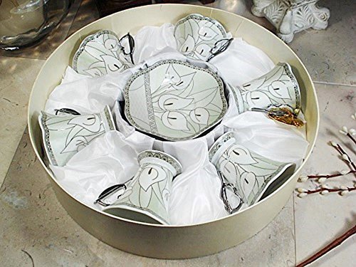 Product Description Serve Espresso anytime in elegant design with this 12 piece Espresso Gift Set offering service for 6 people. Includes 6 cups and 6 saucers, all Espresso size. Displayed in an elegant rose embossed hat box. Each cup is 3 inches tall and 2.5 inches wide making them perfect for both Espresso and Turkish Coffee.