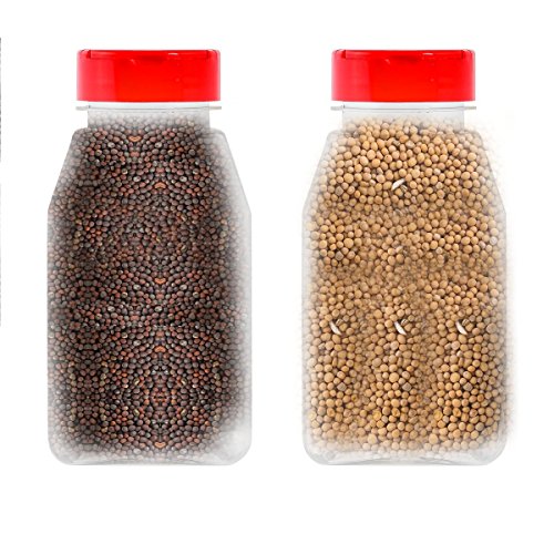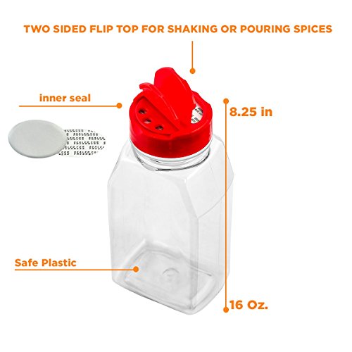 LARGE 16OZ CLEAR PLASTIC SPICE CONTAINERS BOTTLE JARS - FLAP CAP TO POUR OR SIFTER SHAKER. USED TO STORE SPICES, HERBSAND IS REFILLABLE-BPA FREE (6, red caps)