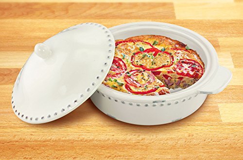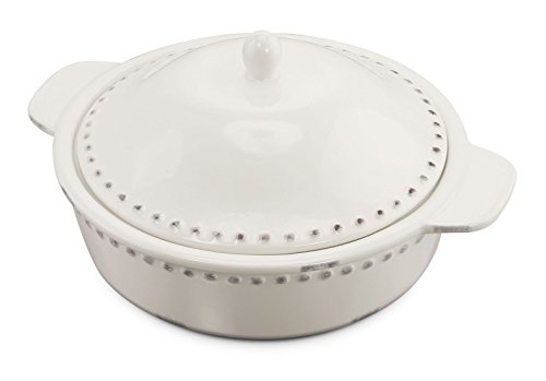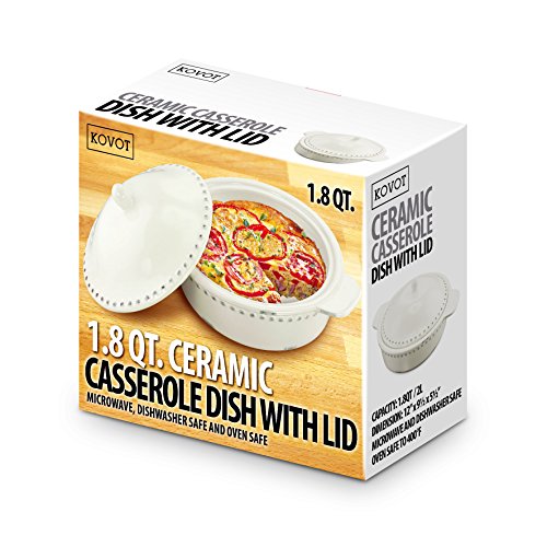 KOVOT 1.8 Quart Ceramic Round Casserole Bakeware Dish With Lid - Ivory White With Antique-Style Finish