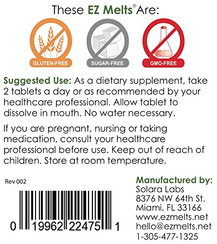 Studio : EZ Melts Publisher : EZ Melts Binding : Health and Beauty Product Description EZ Melts® are a full line of fast melting dietary supplements that are specially formulated to melt in the mouth quickly without the need for water. They are perfect for those who dislike swallowing pills or are prevented from doing so for medical or lifestyle reasons, or simply for those who want the benefits of quality, great tasting supplements. Advantages of EZ Melts®: Tablets melt rapidly in the mouth with a smooth feel - no need for water or swallowing large pills. Active ingredients become readily available for absorption before entering the digestive tract. Great tasting formulas featuring popular ingredients across the spectrum of health categories. We uphold the highest standards of regulatory compliance to ensure that our products are manufactured with safety, integrity and in accordance with the current Good Manufacturing Practices (cGMPs). We are an FDA-registered, USDA-approved facility and have been audited by regulatory authorities. 0