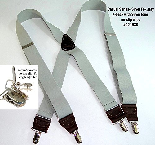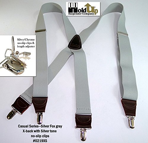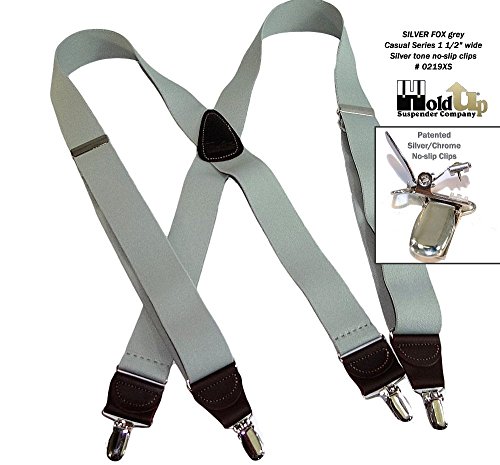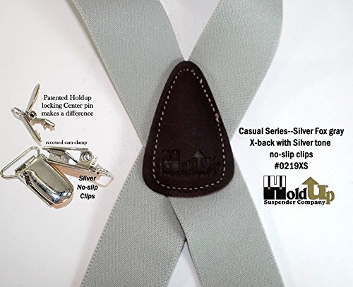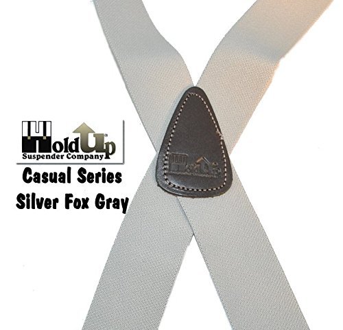 Binding : Apparel Product Description Hold-up's® Casual Series in a SILVER FOX light gray solid color men's suspender featuring our patented No-slip® clip with silver metal finish and length adjuster. This style comes in X-back with brown leather crosspatch and goes with all shirt colors and is great for office or casual wear when you need to make a conservative fashion statement! Great as a birthday or Father's Day gift. All materials are carefully chosen for elastic durability with a fine weave and top grade brown leather crosspatch and tabs. If you need a pair of suspenders that perform year after year...then we'd always suggest a pair of Hold-up® Suspenders for you or a friend. Buy any Holdup Casual series right here at Amazon. Hold-up's® exclusive patented clip-on CASUAL SERIES SUSPENDERS all have: Top quality elastic 1 1/2" wide straps specifically chosen for durability and lasting stretch. All come with the best brown saddle leather tabs that vary in size and taper front to back for more comfort and convenience when attaching them to your pants.... This series features our patented No-Slip® Suspender Clip guaranteed to never slip, slide, or fly off like all other suspenders do. Truly a good investment in comfort, fit and style as Hold-up® Brand suspenders come in over 250 styles and colors. 0
