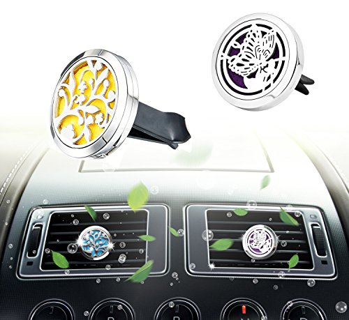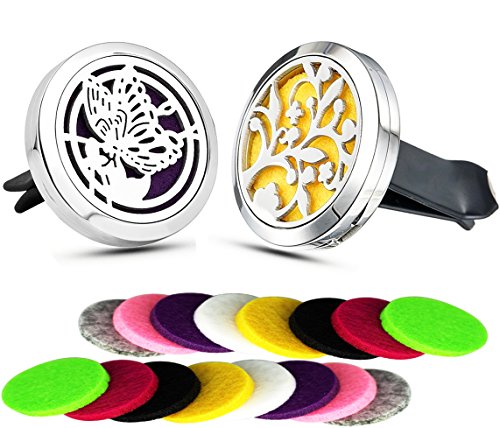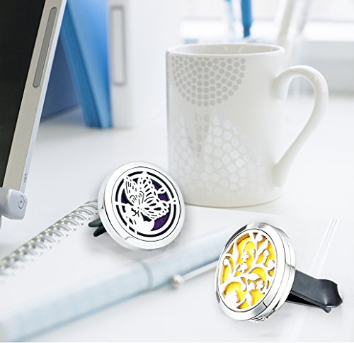Premium Car Freshener Aromatherapy Essential Oil Diffuser Vent Clip, 30mm Hypo-Allergenic Stainless Steel Auto Perfume Diffuser Locket with 16 Colorful Felt Pads(Butterfly & Lucky Tree)