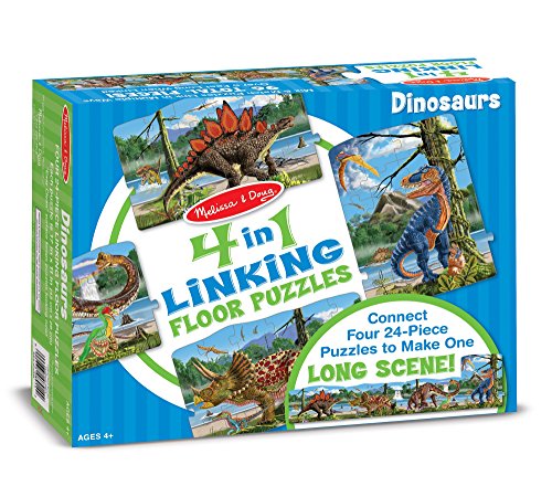 -. Binding : Toy -. Brand : Melissa & Doug -. EAN : 0000772089142 -. Feature : Four 24-piece cardboard jigsaw puzzles that link together to make one 5-foot-long prehistoric scene / Mix and match the 17 x 11-inch (43 x 28 cm) dinosaur-themed puzzles to change the scene / Coded pieces make for easy sorting / Easy-Clean surface / For ages 3+; 12" x 9.25" x 3" package -. Label : Melissa and Doug -. Manufacturer : Melissa and Doug -. Model : 8914 -. MPN : 8914 -. PackageQuantity : 1 -. PartNumber : 8914 -. ProductGroup : Toy -. ProductTypeName : TOYS_AND_GAMES -. Publisher : Melissa and Doug -. Studio : Melissa and Doug -. Title : Melissa & Doug Dinosaurs Linking Floor Puzzle (96 Piece) -. UPC : 000772089142 -. Warranty : No Warranty