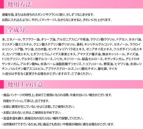 | 成分 | 水、エタノール、サフラワー油、オリーブ油、アルガニアスピノサ核油、ラウリン酸ラウリル、ドデカン、ホホバ油、ミリスチン酸ミリスチル、クエン酸ステアリン酸グリセリル、香料、キシリチルグルコシド、セタノール、ラウロイルリシン、シア脂、ヤシ油、カカオ脂、センチフォリアバラ花エキス、ゼニアオイ花エキス、フユボダイジュ花エキス、カンゾウ根エキス、ヒポファエラムノイデス果実エキス、アマナズナ種子油、無水キシリトール、ダイズ油、トリカプリリン、グルタミン酸グルコース、シリカ、キシリトール、結晶セルロース、キサンタンガム、デヒドロキサンタンガム、アルギン酸Na、水添パーム油脂肪酸グリセリズ、トコフェロール、野菜油、ヒマワリ油、水添レシチン、パルミチン酸アスコルビル、アブラナステロールズ、(+/-)酸化チタン、酸化鉄、マイカ ※成分は予告なく変更される場合がございますので、ご了承ください。 |