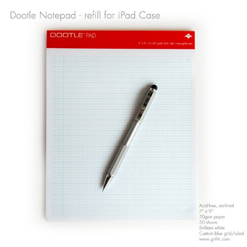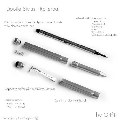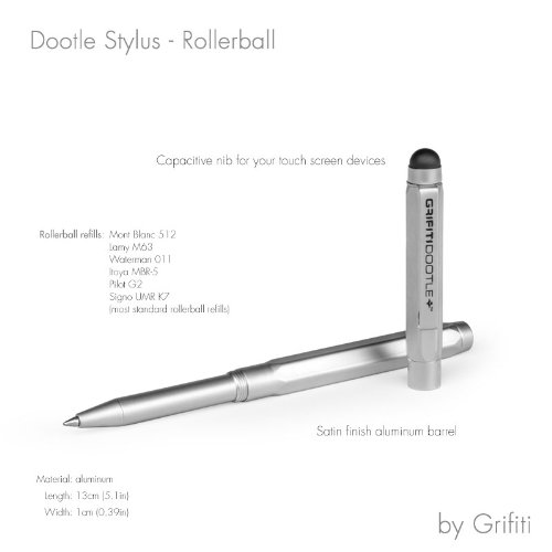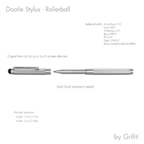 -. Feature : NEW IN 2014! This is our Second Generation Stylus from our Grifiti Tagtools. We have renamed them to fit the Dootle iPad Folios and Dootle Pads for writing. / Dual Capacitive Stylus and Rollerball Pen. Satin, matte, silver aluminum alloy construction for a wonderful feel. / Reversible parts...you can put the replacable capacitive stylus either on the cap or pen body. Removable clip. Hexagon non-roll shape (this really comes in handy if you remove the clip) / Center pen loop notch is perfect for nesting on our Dootle Folios and other pen loops / 1.2 oz weight for a nice, substantial feel Replacable capacitive stylus Medium weight non-drying ink cartridge. Fits the following standard ink cartridges: Pilot G-2,
