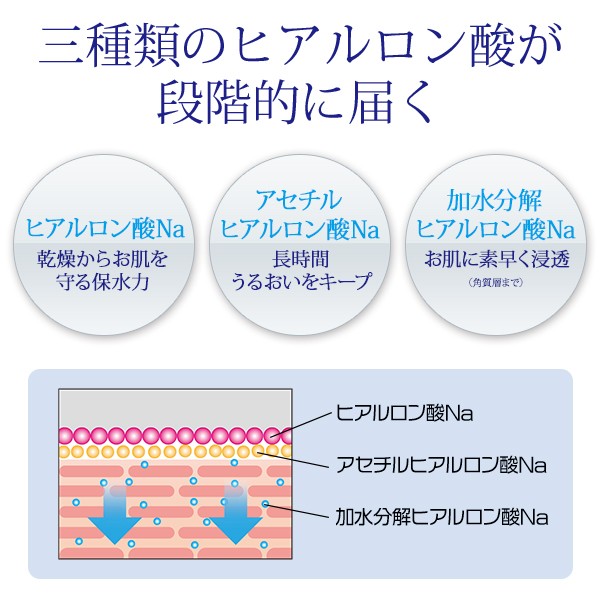 | 三種類のヒアルロン酸が角質層まで浸透し、もっちりハリのあるお肌へ導きます。 |