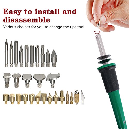 - 【DIVERSE TIPS CHOICES STIMULATE YOUR CREATIVITY】The replaceable joint design of the 26 pcs wood burning tips can not only make you create design on all types of wood, but also can be used to image transferring, stencil cutting, soldering, paper crafting, hot stamping and fabric embossing.