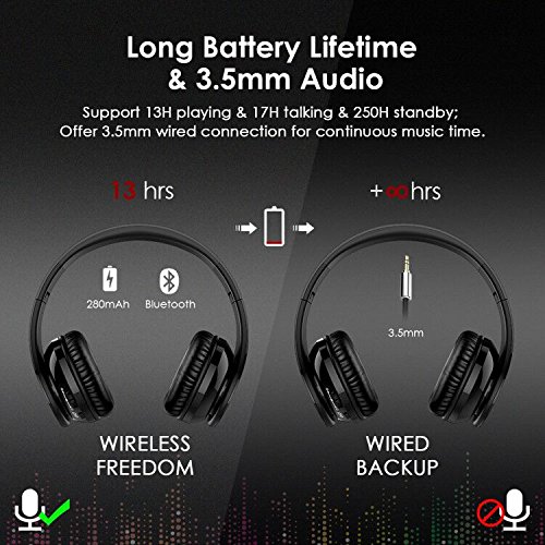 Long Battery Lifetime & 3.5mm Audio: Support up to 13 hours of playing time, 17 hours talking time and about 250 hours standby time when fully charged. Standard 3.5 mm audio cable included for wired mode promise continuous music time.