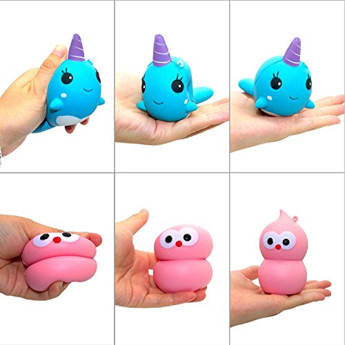 -. Feature : MATERIAL: Material used is of highest quality and nondeformable. It does not cause any unpleasant smell. Elastic Environmentally PU. It has a soft texture, allowing it to bounce back when squished and offering an enjoyable way to relieve stress. / MULTIPLE FORMS: Three different forms: cute bear, whale (random color), and bird (random color). DIMENSIONS: Cute bear: 5.1*3.4 inches, Whale: 4.3*2.9 inches, Bird: 3.7*2.1 inches. The color of bird and whale is random. The lack of the draw! / STRESS RELIEF/CUTE ORMAMENTS/TOY: Squish them to relieve stress, use them to decorate your bag, room, office table or birthday party. They can also be a great gift for your kids. / DECORATIVE/CUTE: You can decorate your room and give a magic touch to your office table using these cute animals designed for both kids and adults. Look into their lovely eyes and feel the energy! / JUMBO SIZE: Squishy stress relief toys come in jumbo size and fit into the palm of your hand. Jumbo size toys are particularly great to get rid of stress while also having fun!