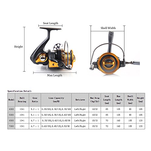 사양: 모델:4000/5000/6000/7000(옵션) 릴 바디 소재:PA66 고강도 나일론 스풀:알루미늄 합금 볼 베어링:13 + 1 취득:좌및우 팩키지크기:15 * 15 * 9.5cm / 5.9 * 5.9 * 3.7in 팩키지의 중량:364-510g / 12.9-18.0oz팩키지 리스트: 1 *써핑 캐스트 릴