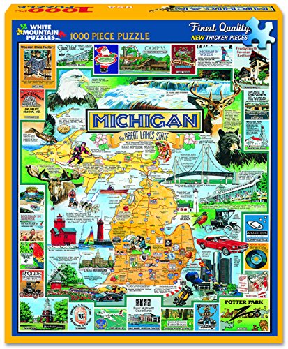-. Binding : Toy -. Brand : White Mountain Puzzles -. Color : green -. EAN : 0724819247400 -. Feature : This US state puzzle honors the great state of Michigan, both as an industrial center and a sportsman's paradise. / James Mellett is a Pittsburgh native and has been a freelance illustrator for almost 20 years working out of his home studio. / Every White Mountain Puzzle is proudly manufactured in America with a 100% customer satisfaction guarantee. / All our puzzles contain unique interlocking pieces that are made of sturdy blue chipboard on recycled paper. / 1000 piece puzzles measure 24"x30" - larger pieces for easy handling -. IsAdultProduct : 0 -. ItemPartNumber : 127PZ -. Label : White Mountain Puzzles, Inc. -. Manufacturer : White Mountain Puzzles, Inc. -. Model : 127 -. MPN : 127PZ -. NumberOfItems : 1 -. PackageQuantity : 1 -. PartNumber : 127PZ -. ProductGroup : Toy -. ProductTypeName : TOYS_AND_GAMES -. Publisher : White Mountain Puzzles, Inc. -. Studio : White Mountain Puzzles, Inc. -. Title : White Mountain Puzzles Best of Michigan - 1000 Piece Jigsaw Puzzle -. UPC : 724819247400
