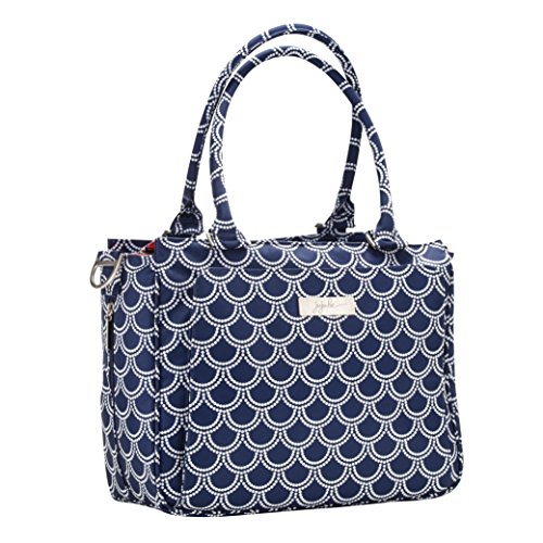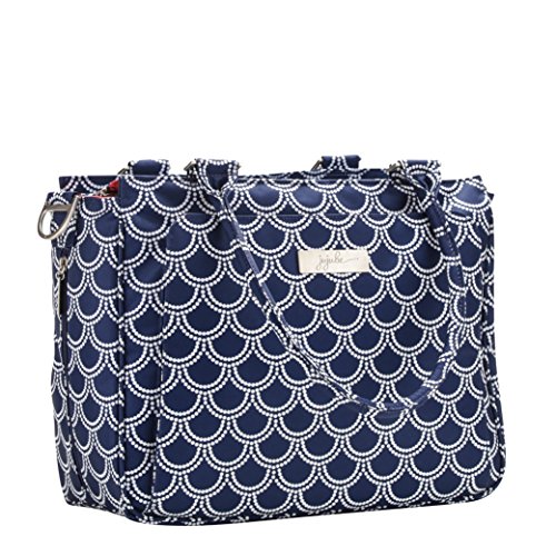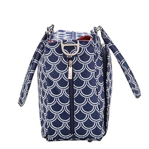 Glittering mermaid scales or the perfect strand of pearls....or perhaps whitecaps on a brisk sailing day. Classy seaside navy and shimmering white create a refined exterior, while the coral Palm Beach lining takes a dip into your playful side. This stunning print mixes and matches perfectly with all the other gems in Ju-Ju-Be's Coastal Collection. The Ju-Ju-Be Be Classy Diaper Bag is like you - a class act. You might spend a majority of your days covered in baby food, or picking up the playroom for the 100th time, but have no doubt: you are still the same classy woman you have always been and will always be. Which is why we want to thank you for the inspiration behind this bag design. Thanks to the feedback from our talented fan base we were able to create the Be Classy: a bag that is a testament to the spirit of the Pink Ladies that make Ju-Ju-Be great, and the standard to which we always strive. A bag that is not only one of our most functional, tailored designs, but also possibly the most timeless. With its sleek design and adjustable messenger strap or structured handbag style carrying options, the Be Classy is the perfect culmination of your favorite Ju-Ju-Be features. A bag so functional you will bring it on your first outing with your newborn, and one so elegant you will carry it well after the diapering days are done. The light colored lining is protected with an Agion natural antimicrobial treatment that inhibits and reduces the growth of odor-causing bacteria, mold and mildew. The outer fabric is treated with Teflon fabric protector, making it easy to repel stains. The front "mommy" pocket holds keys with a stretch key fob and sunglasses (cleans lenses too.) with plenty of room for more. The main zipper pocket is large enough for diapers, wipes, extra clothes and other items. Keep organized inside with (3) gusseted pockets and (1) zippered pocket. TFeature