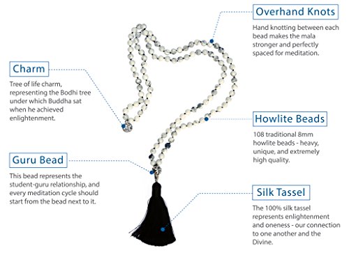 * Connect with a millenia-old tradition, delivered under the highest quality standards. All of our malas contain 108 howlite gemstone beads, a 100% silk tassel, a small charm, and a larger guru bead, which indicates the beginning and end of each mantra counting cycle. All beads are 8mm in diameter, and are separated with traditional hand tied knots, which prevent beads from sliding into one another and damaging the string. The larger "meru" bead represents a state of transcendental consciousness - drawing the mind to settle inward beyond thought to experience the source of thought itself.