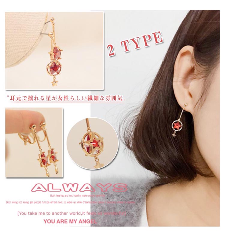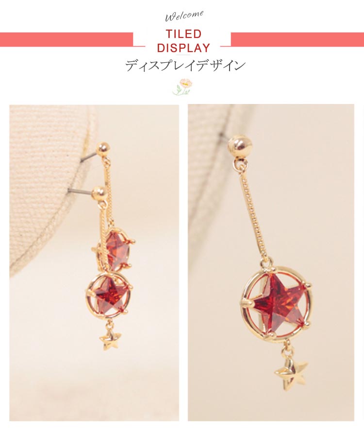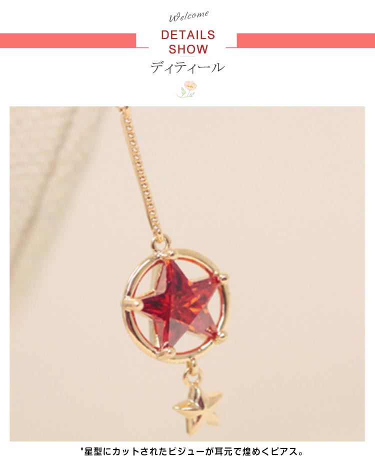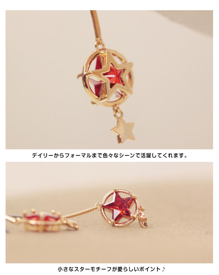 | 耳元で揺れる星が女性らしい繊細な雰囲気。キラキラしたビジューの輝きが顔周りを明るく華やかに仕上げるアイテム。つけるだけで大人のエレガントさをプラスします。邪魔にならない大きさでさりげなく上品さをUPさせる華やかさです。 | |