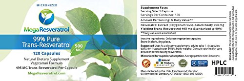 Mega Resveratrol, Pharmaceutical Grade, 99% Pure Micronized Trans-Resveratrol, 120 vegetarian capsules, 500 mg per capsule. Purity certified. Absolutely...