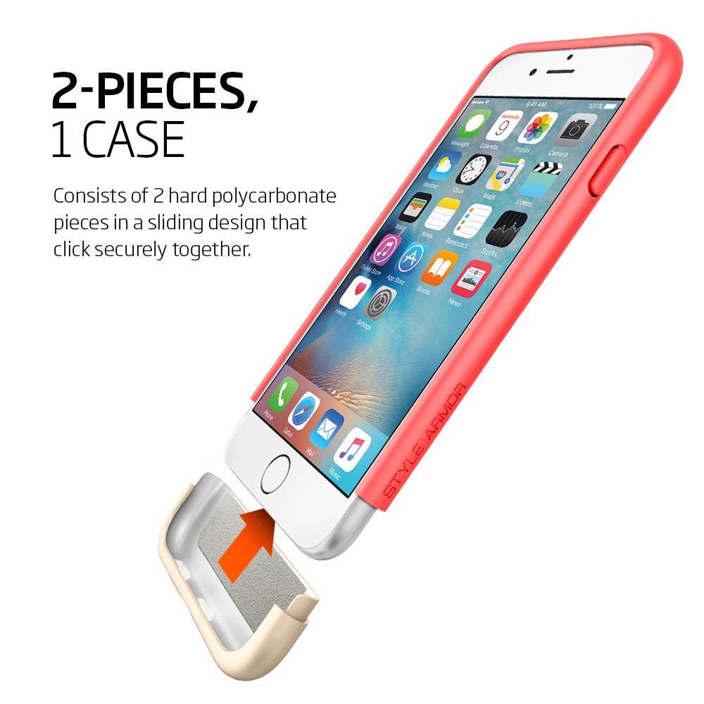 Spigen's Style Armor offers your iPhone 6s the perfect amount of decor with a smart 2 piece design in vivid colors. The hard polycarbonate case with a soft inner lining ensures all sides are covered in a two tone palette that brings mini alism to the forefront for a trendy appearance that hugs the phone comfortably. Compatible with iPhone 6 (2014) / iPhone 6s (2015).