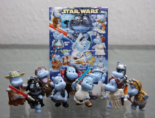 -. Binding : Toy -. Brand : Star Wars -. EAN : 4022489703230 -. Feature : Star Wars - 2002 Complete set of 10 Star Wars Hippo Kinder Surprise Figures from Germany ( Das Hipperium spielt verrückt ) - Ferrero / Complete set of 10 pieces - 2002 Star Wars Hippo Kinder Surprise figures & 1 info paper from Germany. / Figures are made of plastic and measure between approx. 1½" tall / German Names : Wookiee Chewbacca - Darth Vader - R2-D2 - Happy Han - Jedi Meister Yoda - Jango Fett - Luke Skywalker - Obi-Wan Kenobi - H Ipo - Prinzessin Leia. -. IsAdultProduct : 0 -. Label : Ferrero -. Manufacturer : Ferrero -. ProductGroup : Toy -. ProductTypeName : TOYS_AND_GAMES -. Publisher : Ferrero -. Studio : Ferrero -. Title : Star Wars - 2002 Complete set of 10 Star Wars Hippo Kinder Surprise Figures from Germany- Ferrero