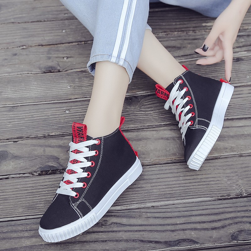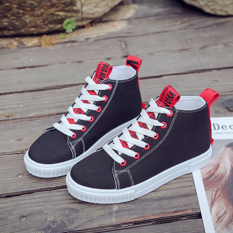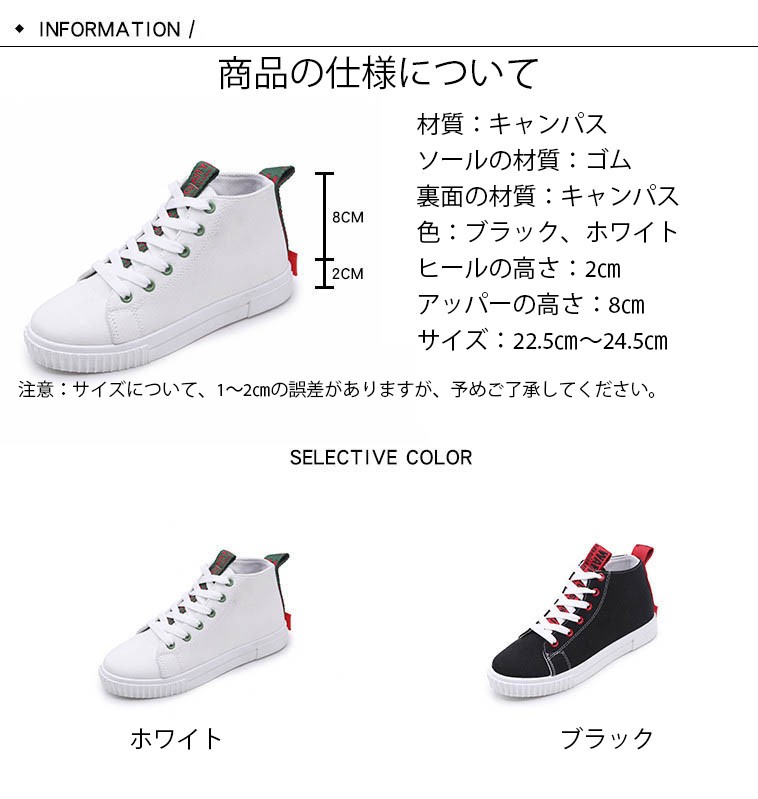 材質:キャンパス ソールの材質:ゴム裏面の材質:キャンパス 色:ブラック、ホワイトヒールの高さ:2cm アッパーの高さ:8cmサイズ:22.5cm~24.5cmEU36=22.5cm EU36=23cm EU37=23.5cm EU38=24cm EU39=24.5cm EU40=25cm 注意:※ サイズなど、商品詳細を必ずご確認後、ご了承頂いた上でご購入をお願いします。また、採寸方法違いにより、0.5~1cmの誤差がございますので、ご了承ください。特徴:【軽量、通気性よい】ゴムのソールとキャンパスの材質でスポーツシューズならではの軽さを実現し、通気性もよいです。どんな季節でも着用します。 軽量なので、ランニングや歩くや他の運動が易くになりました。【ファッションな配色】ファッションな配色で、シューズがファッションになり、女性に最適です。中学生などに通学靴としてもよい選択です。 【ゴムのソール耐滑】柔らかい材質で作って、ゴムのソールので、耐滑のです。スムーズな足運びをサポートします。球技や他の運動にもスムーズになりました。【利用場合】スポーツだけでなく、通勤や通学やアウトドア、普段履きとしても カジュアルなコーディネートをお楽しみい ただけます。
