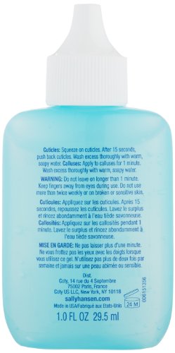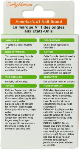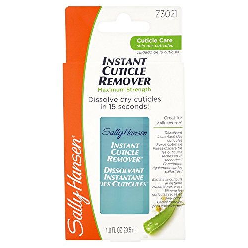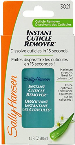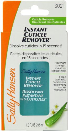 -. Binding : Health and Beauty -. Brand : Sally Hansen -. Feature : Dissolve dry cuticles in 15 seconds / Great for calluses too this revolutionary formula helps break down excess cuticles in seconds and contains moisturizing aloe and chamomile to help condition and soothe / This revolutionary formula helps break down excess cuticles in seconds and contains moisturizing aloe and chamomile to help condition and soothe -. Label : Coty Beauty -. Manufacturer : Coty Beauty -. MPN : SH3021 -. PackageQuantity : 1 -. PartNumber : SH3021 -. ProductGroup : Health and Beauty -. ProductTypeName : HEALTH_PERSONAL_CARE -. Publisher : Coty Beauty -. Studio : Coty Beauty -. Title : Sally Hansen Instant Cuticle Remover, 1 Fluid Ounce