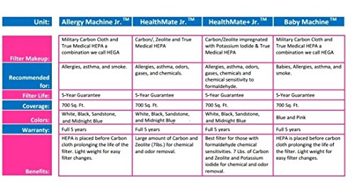 - The Allergy Machine Jr™ provides a comprehensive air cleaning solution, removing allergens, asthma irritants, sub-micron particles, chemicals and noxious gases. Every minute, The Allergy Machine Jr™ draws over 125 cubic feet of air through a 4-stage HEGA filter containing Activated Military Carbon Cloth and over 30 square feet of True Medical Grade HEPA. The result, more clean air delivered faster and more efficiently than any other air purifier on the market.