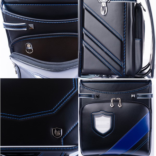 内装:黒無地、錠前:ワンタッチロック、補強:ガッチリガード、ポケット:ワイドポケット・Dカン付、肩ベルト:ふわりぃ仕様・長尺・9穴・右(Dカン)・左(小ナスカン)、鋲:イナズマ、ナスカン:反射材付、冠裏:黒無地、反射材:冠下部・前締め・肩ベルト、固定型持ち手、カラー:ブラック×ロイヤルブルー