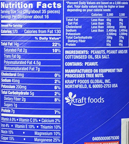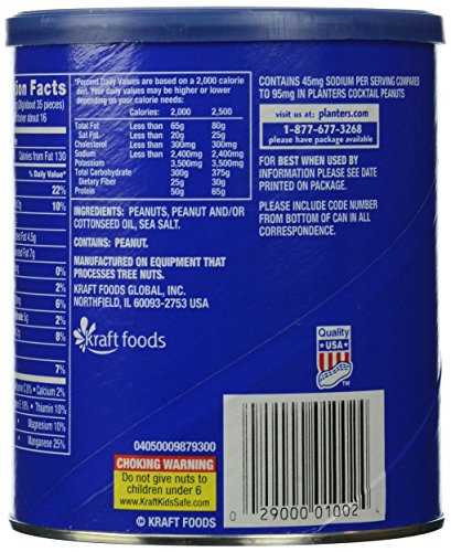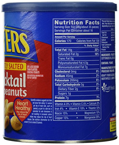 -. Feature : Contains 6, 16oz cans; 96oz total / Oil roasted and lightly salted, USA-grown and harvested peanuts. / 50% Less salt than planters cocktail Peanuts / Canister / Kosher