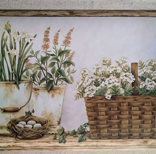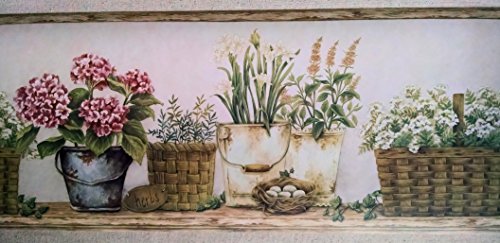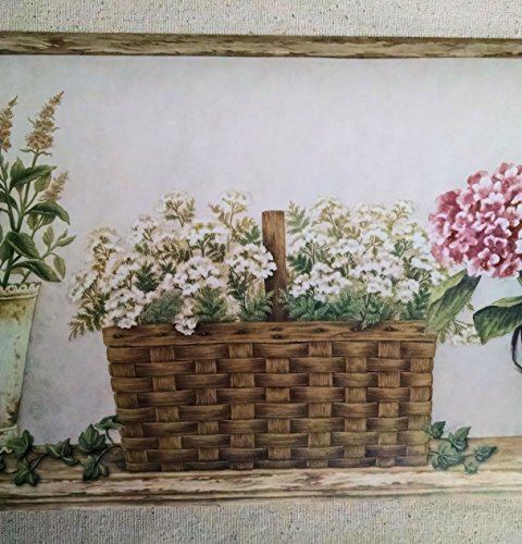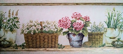 -. Feature : 15 Foot Long Spools - Prepasted Wallpaper Border / Pattern: CAB3267 - Tan / 9 Inches Wide / Flowers Wallpaper Border / Flowers, Baskets, Country Wallpaper Border