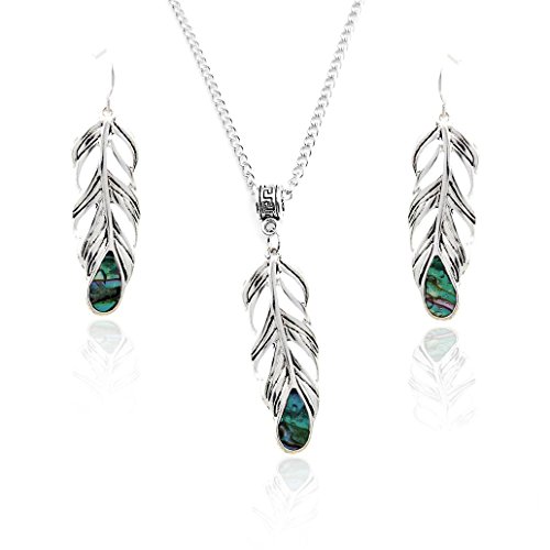 -. Title : Antiqued Silver Feather with Abalone Teardrop Inlay: Necklace and Earring Set