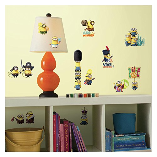 -. Binding : Tools & Home Improvement -. Brand : RoomMates -. Color : Multi -. EAN : 6351622107368 -. Feature : Comes with 16 wall decals; decal range size 2.6"wide x 5"high to 3.7"wide x 16.3"high / Easy to apply - just peel and stick / Applies to any smooth surface / Decals are removable and repositionable with no sticky residue / Wall Decals made in the USA -. IsAutographed : 0 -. Label : York Wallcoverings - Wall Decals -. Manufacturer : York Wallcoverings - Wall Decals -. Model : RMK3000SCS -. MPN : RMK3000SCS -. NumberOfItems : 1 -. PackageQuantity : 1 -. PartNumber : RMK3000SCS -. ProductGroup : Home Improvement -. ProductTypeName : BUILDING_MATERIAL -. Publisher : York Wallcoverings - Wall Decals -. Studio : York Wallcoverings - Wall Decals -. Title : RoomMates RMK3000SCS Minions The Movie Peel and Stick Wall Decals, 16 Count -. UPC : 034878061450