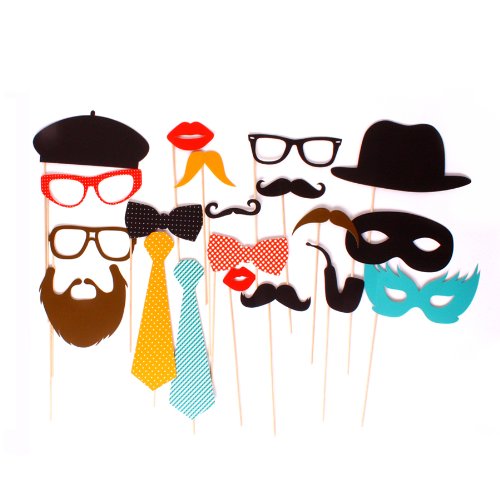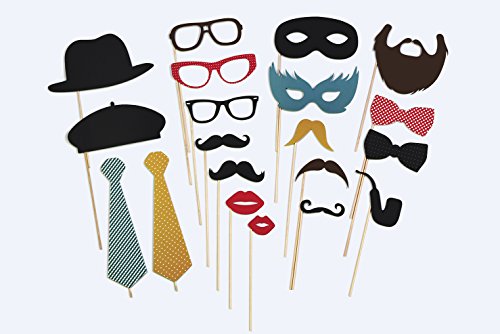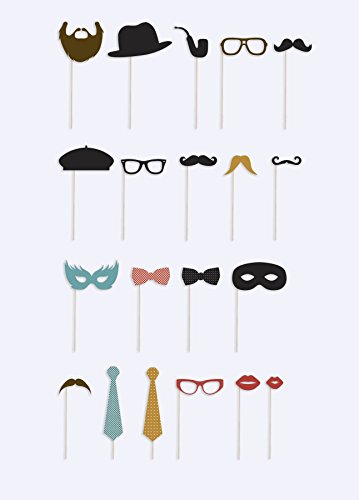 -. Feature : Lieferumfang: 1x Photo Booth - lustige Accessoires / 20 verschiedene Foto Accessoires am Holzstab / zum Aufpeppen von Fotos / Bart, Hut, Pfeife, Brille, Maske, Fliege, Krawatte, Lippen / Material: Pappe & Holz