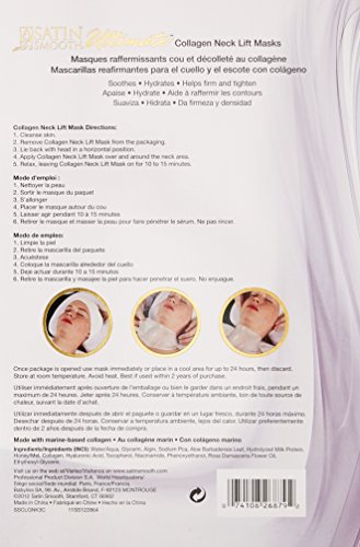 Satin smooth collagen masks are made with marine based collagen technology. A perfect addition to any facial or express skincare service or after a waxing service. Neck lift soothes and refreshes, moisturizes and hydrates and helps firm and tighten. Blended with wholesome ingredients of milk 'n honey that exfoliate and hydrate the skin. Natural plant ingredients and marine based collagen boost skin's firmness. Aloe, vitamin e, vitamin c and rose oil soothe and nourish. Suitable for all skin types and recommended for: hyperpigmentation dehydrated skin stressed skin reduce age and sun spots perfect for spa treatments, express facials or add-on services perfect add on to any facial soothing and refreshing moisturizes and hydrates firms and tightens.